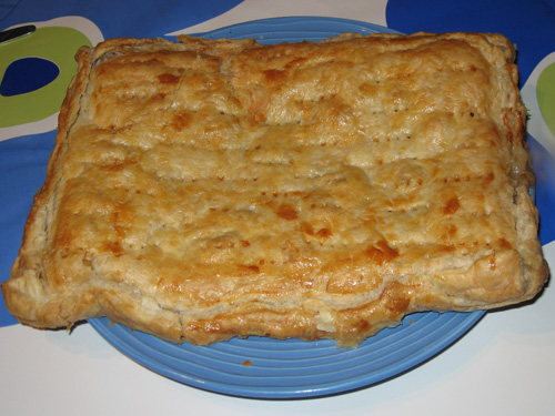 La puedes encontrar en el Tesco de vuestra zona, y se llama «puff pastry»