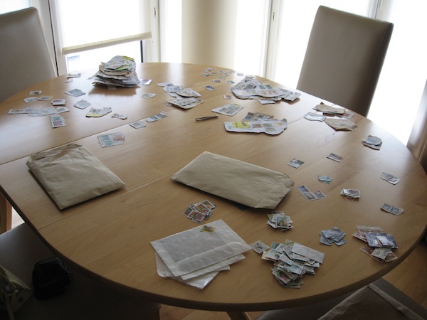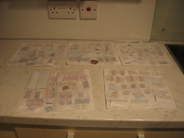 Así que me puse manos a la obra y tras inundar el fregadero y uno de los lavabos, separé cuidadosamente los sellos del papel en el que estaban y los puse a secar. El resultado quedó esparcido por tooooda la casa: