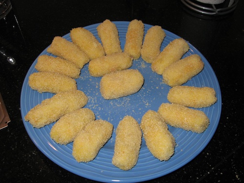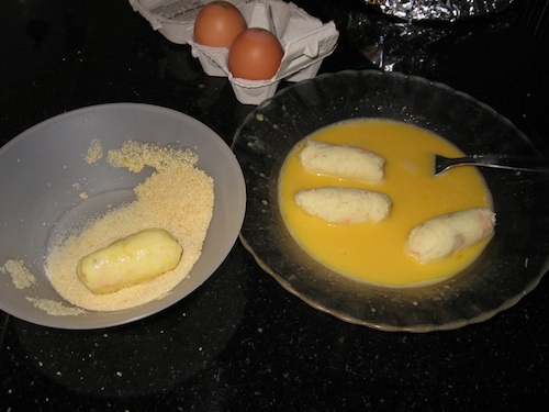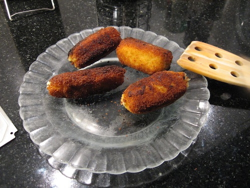 Hice las croquetas con toda la masa, pero luego sólo freí unas pocas. El resto, una vez empanadas, las congelé, para ir sacándolas poco a poco.