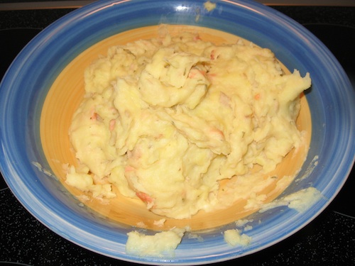 Hacer un puré de patatas espesito, según las instrucciones del paquete. Yo, por ejemplo, en lugar de echarle el agua como sugerían, lo hice con leche (así, ligerito… :P). Añadir al puré el queso rallado, para aderezarlo un poco, y una pizca de sal.
