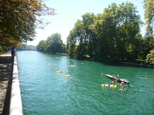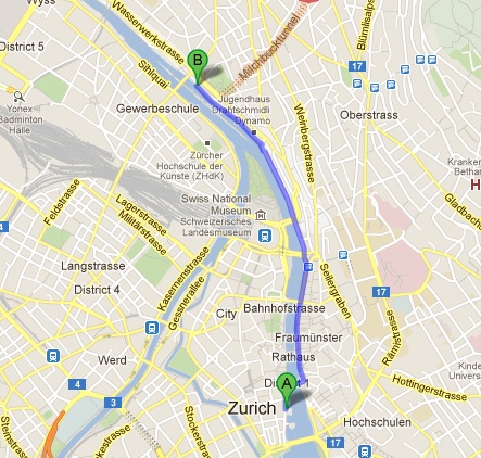 ¿Qué es el Limmatschwimmen? Pues es una carrera de 2000 m por el río Limmat que va desde el Frauenbadi (A) hasta el Flussbad Oberer Letten (B)