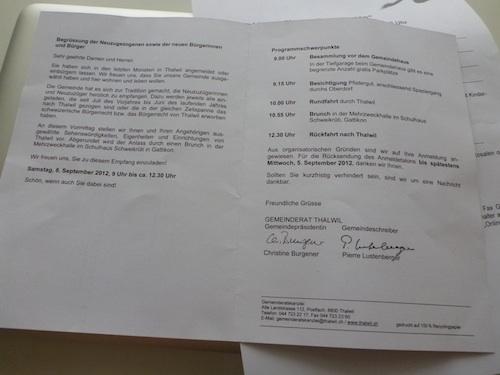 Hace unos días nos encontramos en nuestro buzón con una invitación del Ayuntamiento (Gemeinde) a los nuevos recién mudados.