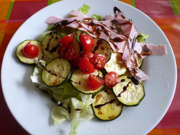 En un plato, montar la ensalada poniendo primero la lechuga, luego el calabacín, el tomatito y el jamón york.