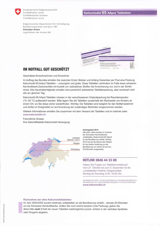 Por lo visto, tocaba ya cambiar las pastillas (las anteriores se distribuyeron hace 10 años), y encima, tras lo de Fukushima, en Suiza se amplió la zona de riesgo de los antiguos 20 km de radio a los actuales 50 km. Así que ha tocado avisar y distribuir a más gente…