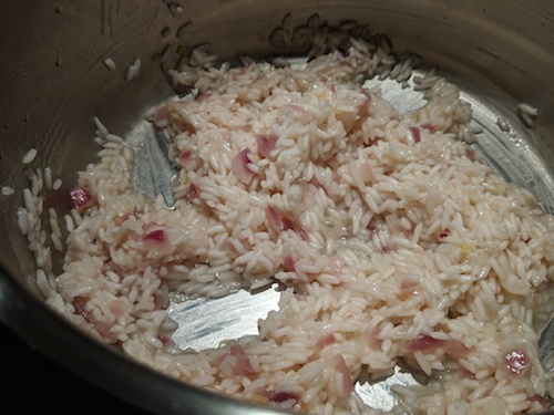 Cuando la cebolla ya esté, añadimos a la cacerola el arroz (previamente enjuagado) y lo rehogamos unos minutos. Verter un chorro de vino blanco y remover bien junto con el arroz hasta que se evapore.