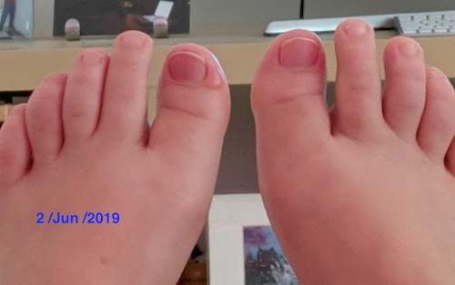Mis pies, sobre todo las uñas de los dedos gordos, me empezaron a doler a las 3 horas de bajada. Al quitarme las botas en casa (1 de junio) vi que me habían salido algunas ampollas y el color de las uñas era rosita, pero un rosita raro. Además las sentía como postizas, como si no fueran mías: daban punzadas (mi corazón se había trasladado a mis pies?) y dolían.
