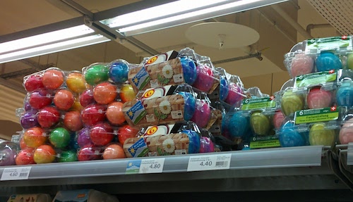 Se ve que cocer un huevo (o dos o tres) es tarea difícil y los necesitan comprar ya directamente cocidos. Claro que éstos son coloreados según la época y las modas. Los de venta durante todo el año suelen ser de colores vibrantes y monocromáticos. Los de Pascua, varían según las modas y los gustos. Este año (y el pasado) se ve que se llevan los colores pastel metalizados. Jajaja.